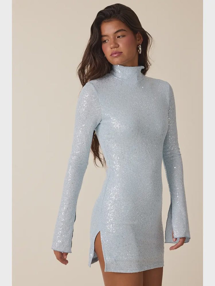 Shine Blue Sequined Long Flare Sleeve Slit Mini Dress