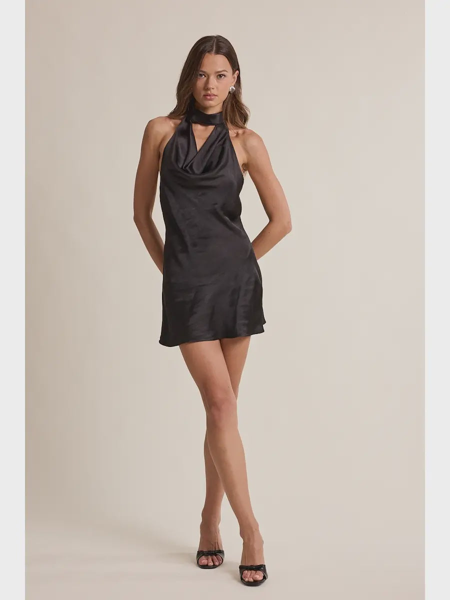 Black Holiday Satin Mock Cowl Neck Open Back Mini Dress