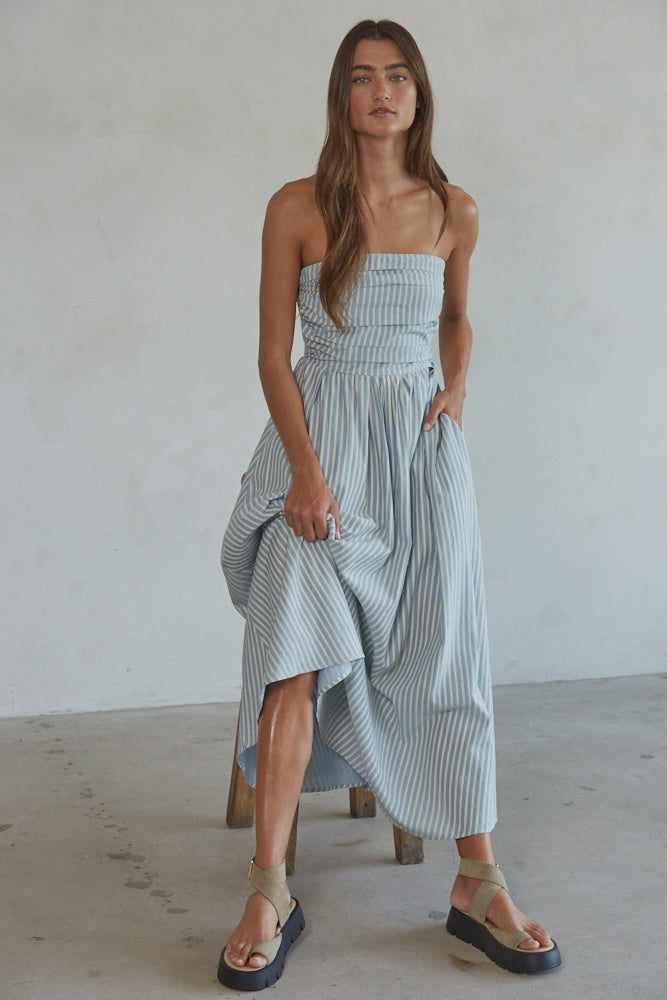 Dusty Blue Striped Tube Neck Strapless Flare Maxi Dress