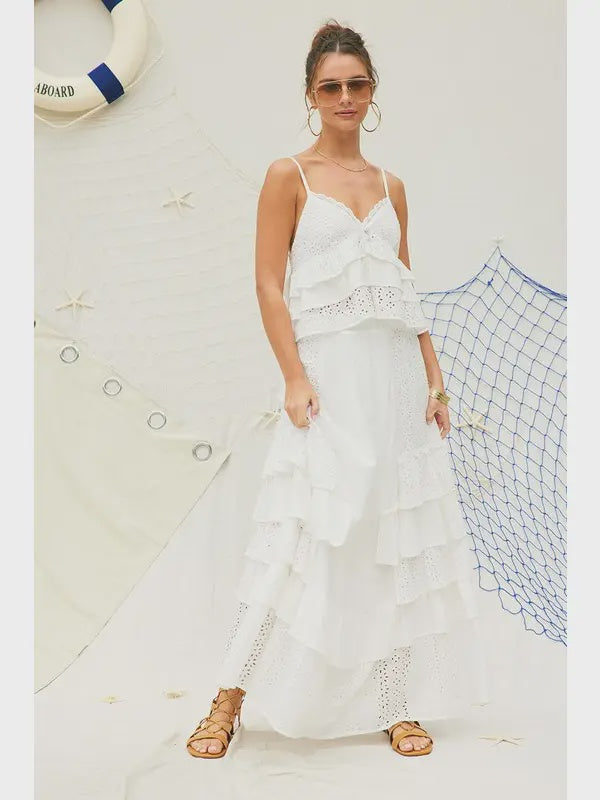 White Eyelet Ruffle Maxi Skirt And Eyelet Cami Top