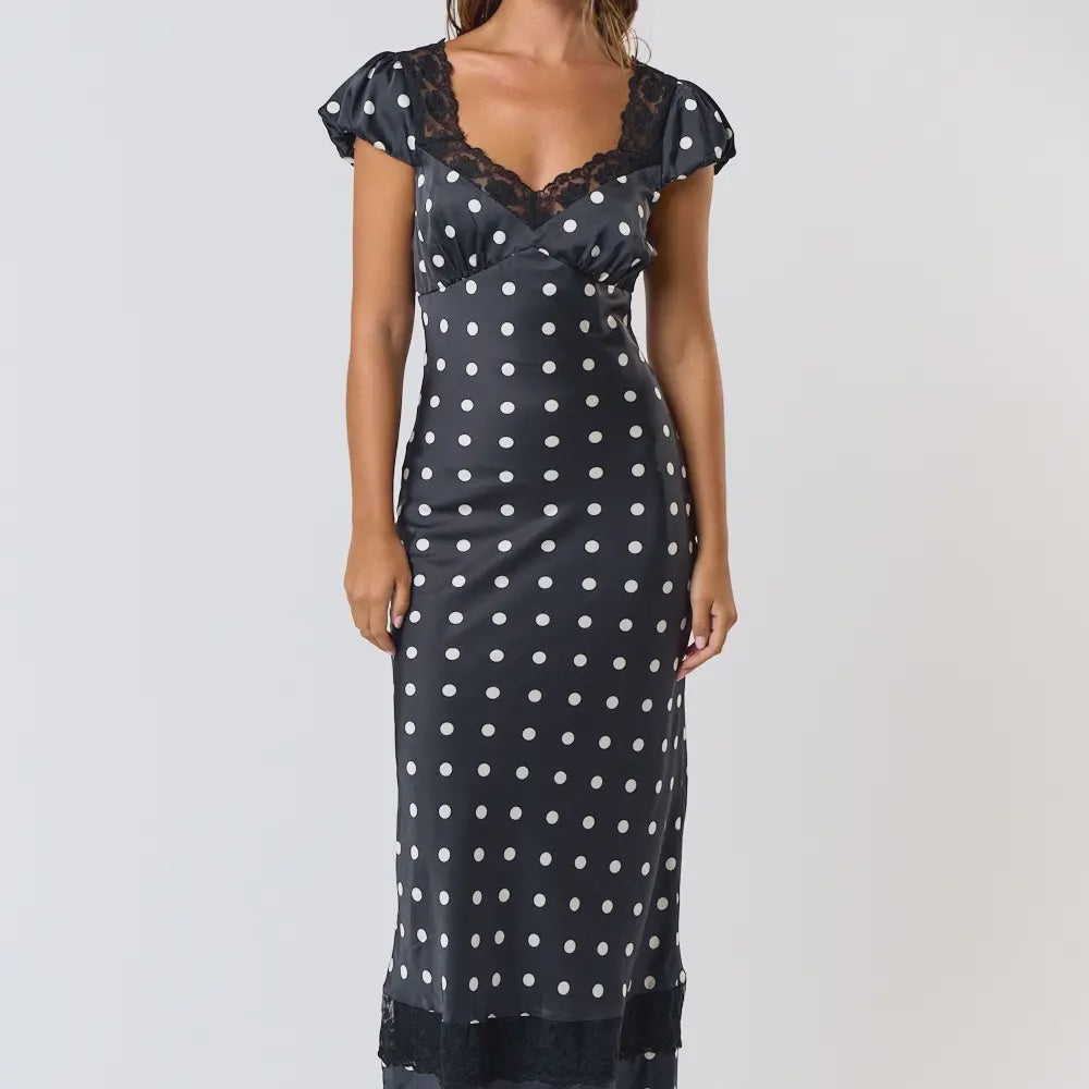 Black/White Polka Dot Satin Lacy Maxi Dress