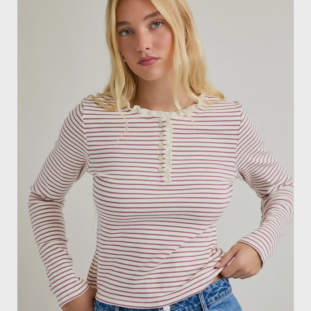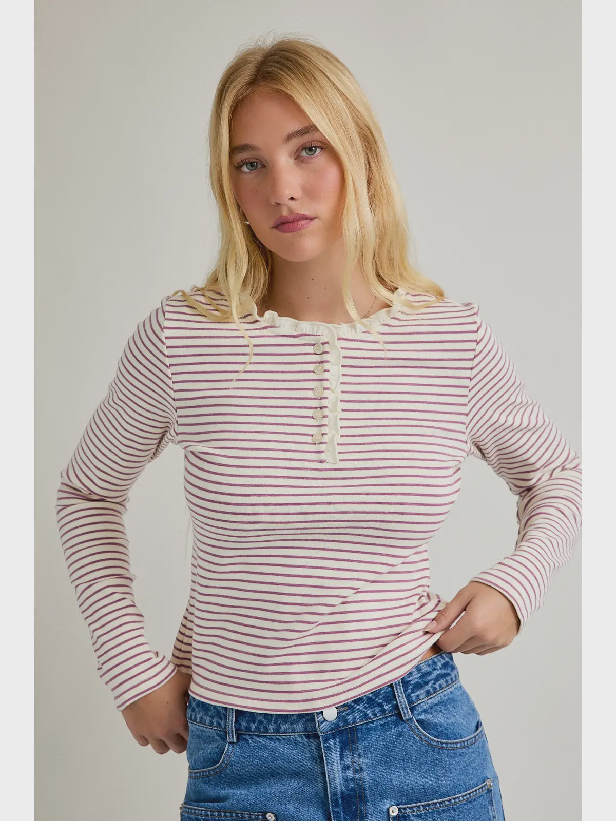 Cream/Lavender Stripe along Sleeve Top With Lace Trim