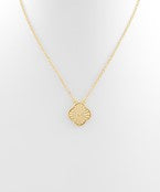 Elevate your look with our Textured Clover Pendant Necklace! This elegant piece features a unique textured clover pendant, adding a touch of charm and sophistication to any outfit. Perfect for adding a pop of style to your everyday wardrobe or dressing up for a special occasion. Make a statement with our Textured Clover Pendant Necklace today!